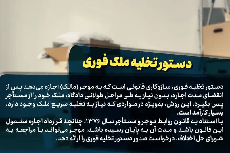 در رابطه با دستور تخلیه فوری نکتهای وجود دارد؛ طبق ماده 2 قانون روابط موجر و مستاجر سال 1376، چنانچه قراردادهای اجارهای توسط دو نفر شاهد امضا نشده باشند یا قرارداد با قید مدت در دو نسخه تنظیم نشده باشد، شامل تخلیه فوری نمیشوند. به طور کلی حکم تخلیه مستاجر از سه قانون روابط موجر و مستاجر مصوب سالهای 1356 و 1376 و قانون مدنی تابعیت میکند.